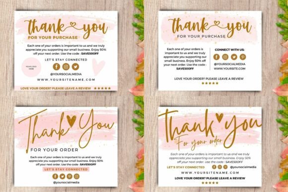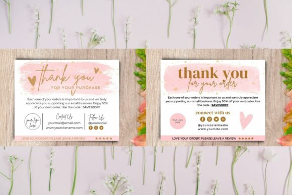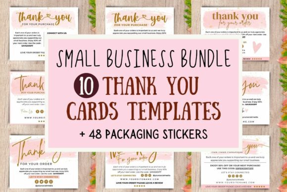 This is the bundle of thank you cards and packaging stickers. It contains 16 thank you cards template and 48 PNG stickers for packaging.